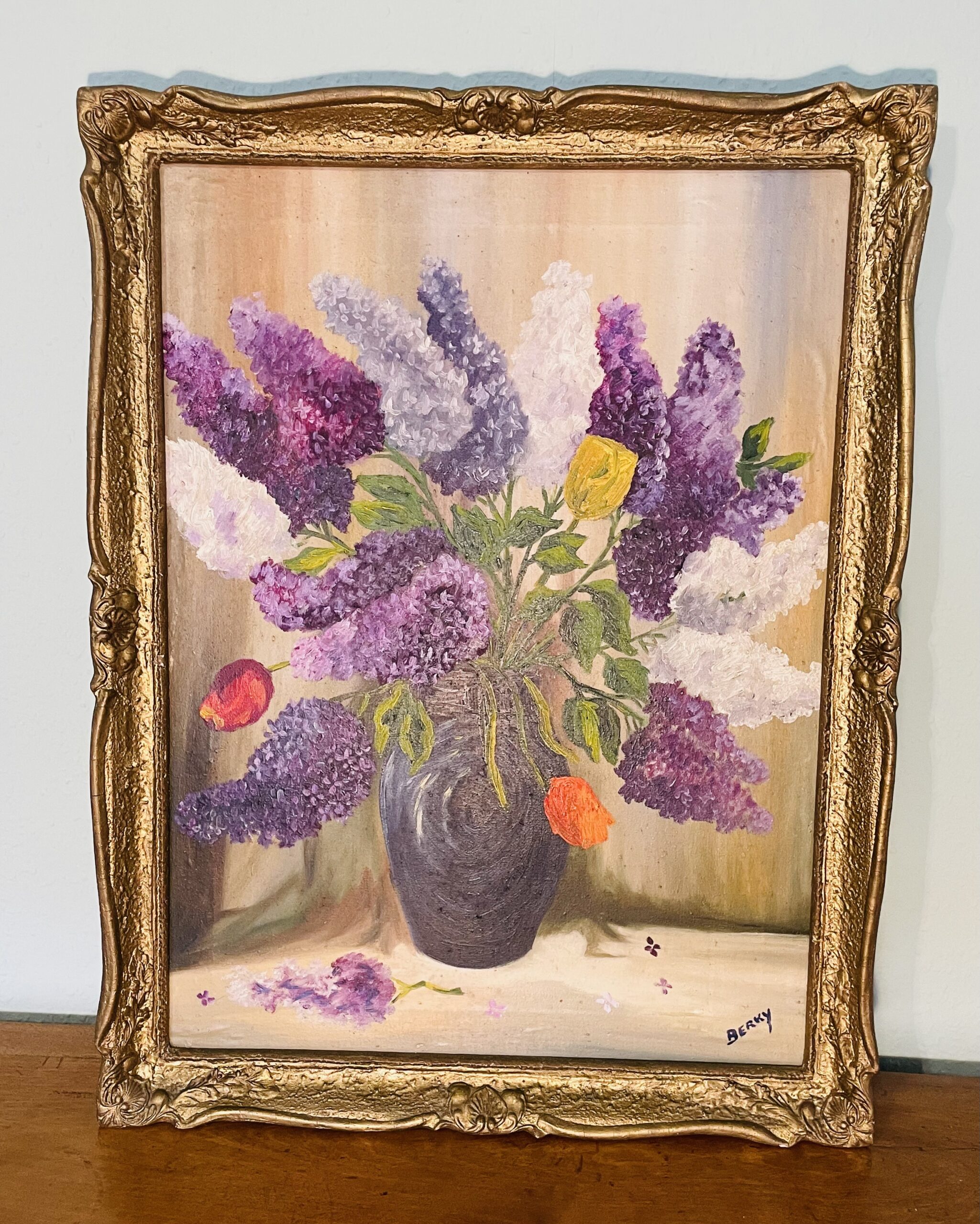 Antikes Öl-Gemälde aus den 1930/40er Jahren – Signiert ,,Berky“ – Stuckrahmen – Blumenstillleben mit Flieder und Tulpen