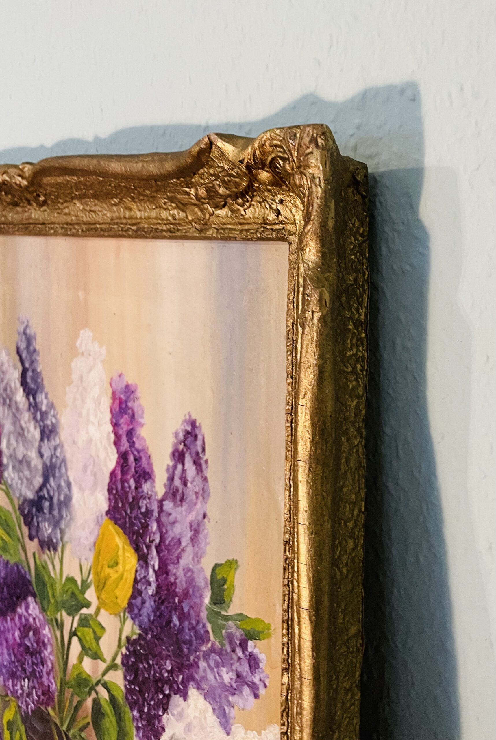 Auf dem Gemälde präsentiert sich ein Blumenstillleben mit Flieder- und Tulpenmotiven – eine klassische Symbolik für Zartheit, Schönheit und Vergänglichkeit. Der Flieder steht für Bescheidenheit und Eleganz, während Tulpen Vielfalt und Lebensfreude symbolisieren. Die Ölmalerei ermöglicht feine Nuancen in Farbe und Licht, wodurch Tiefe und Volumen entstehen. Die Pinselführung wirkt ruhig, präzise und doch lebendig, wodurch das Arrangement eine beinahe fotografische Klarheit erhält, ohne seine malerische Wärme zu verlieren.