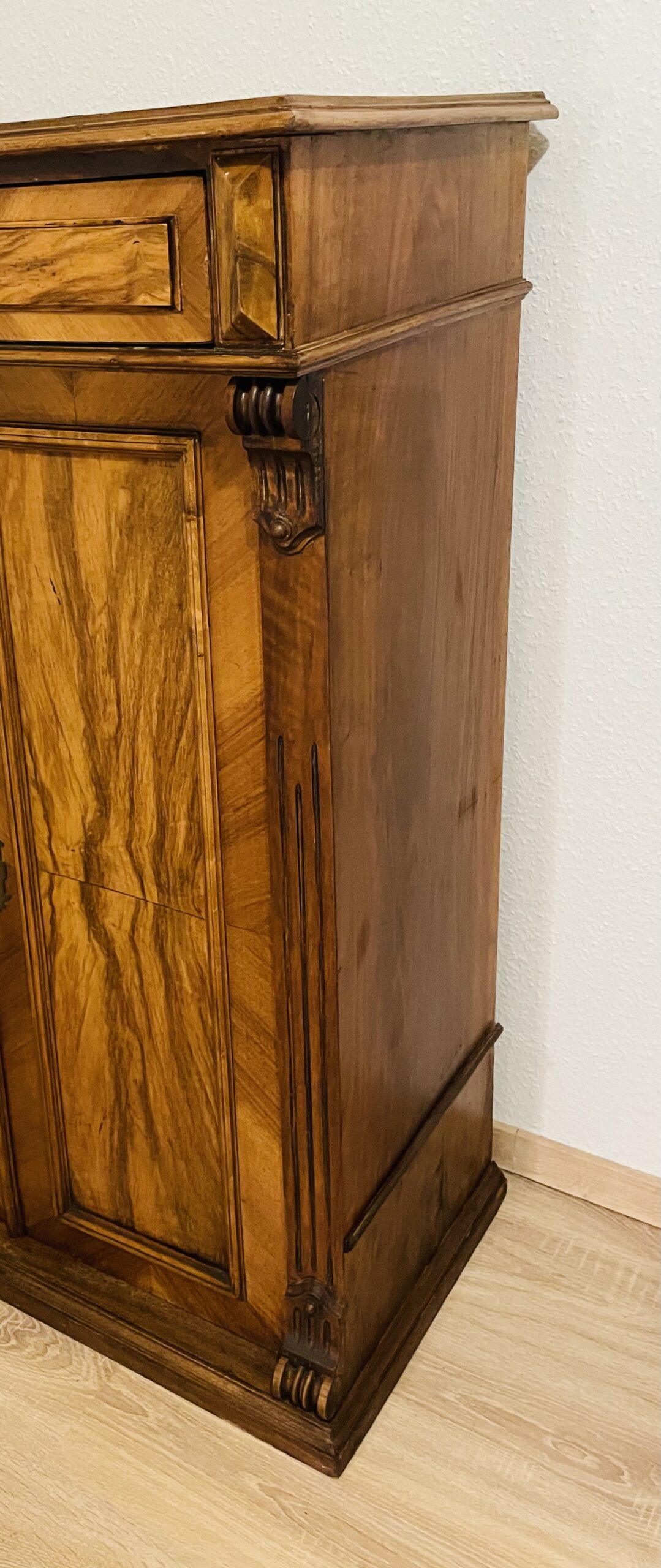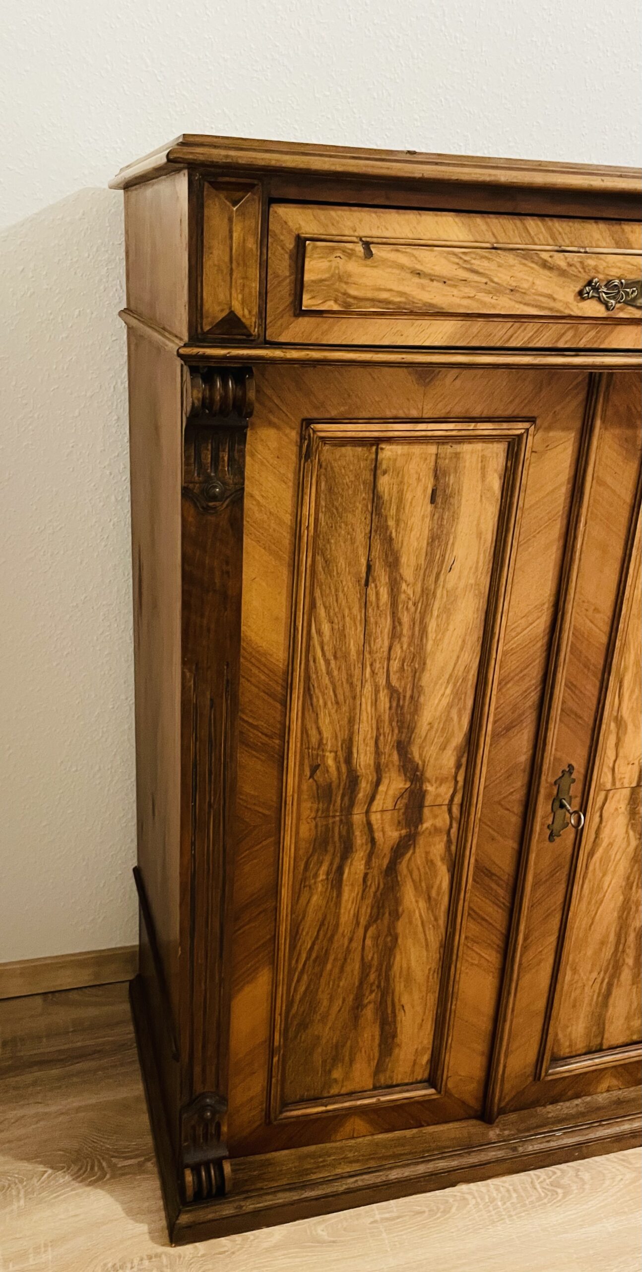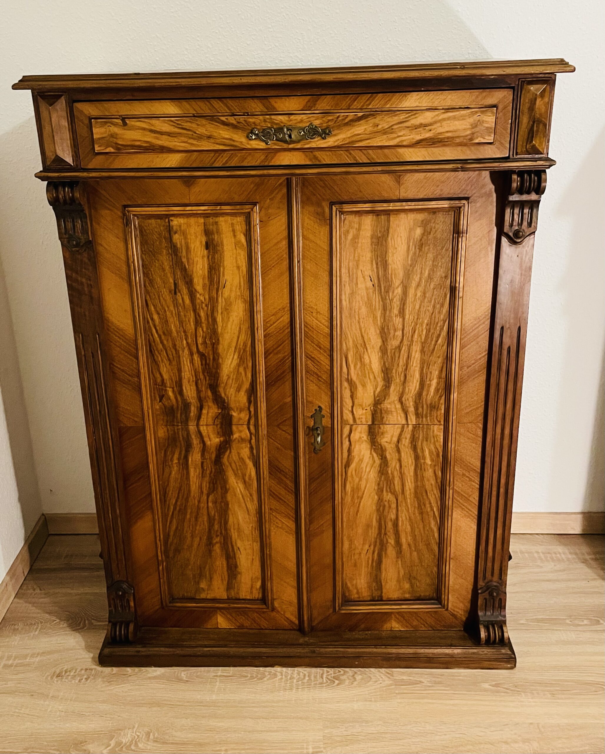 Die Gründerzeit war bekannt für ihre hochwertige Handwerkskunst, ausgewogene Proportionen und elegante Dekorationselemente, die sich in diesem Vertiko deutlich widerspiegeln. Die gespiegelte Fladerung, bei der die Maserungen des Nussbaums symmetrisch angeordnet sind, sorgt für eine besonders harmonische und edle Optik.