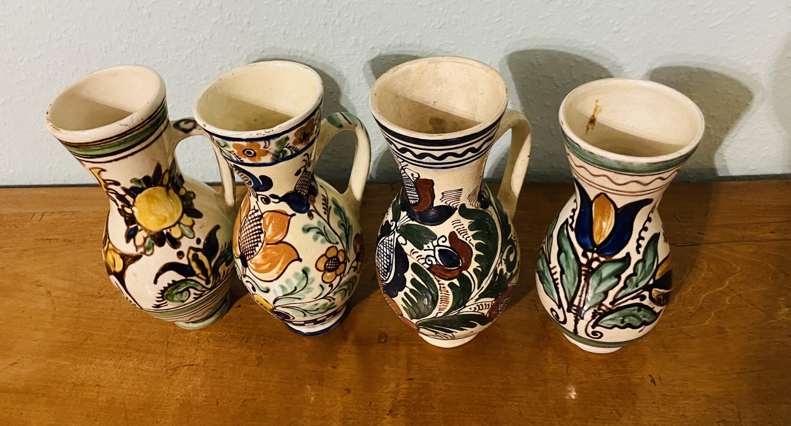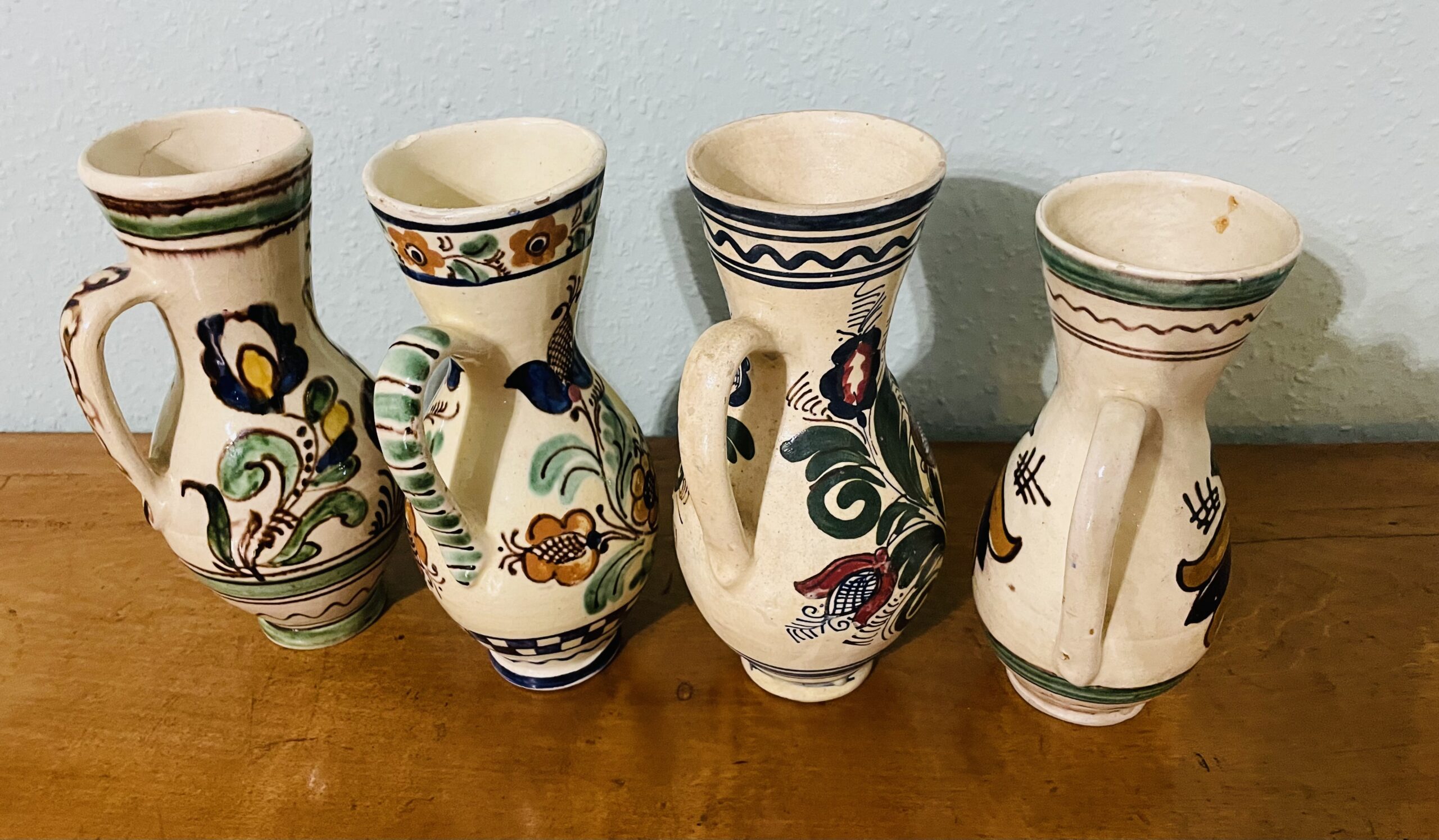 Verkaufe ein schönes, historisches Keramik-Set aus den 1890er Jahren, das die Handwerkskunst der Siebenbürger Sachsen eindrucksvoll widerspiegelt. Jedes Stück dieser Sammlung wurde traditionell von Hand bemalt und besticht durch feine Ornamentik, warme Glasuren und eine authentische Patina, die die Geschichte jedes Kruges lebendig macht. Das Set umfasst vier Krüge. Die Motive und Linienführung reflektieren die typischen siebenhürgerischen Designelemente jener Epoche, verbunden mit europäischen Einflüssen, die das Ensemble zu einem echten Sammlerobjekt machen.